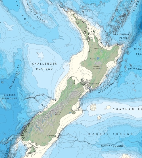 La Nouvelle-Zélande au Sud de l’Australie est composée de deux îles (Nord et Sud) séparée par le détroit de Cook. La présence d’un canyon profond près des côtes explique sa richesse en cétacés.