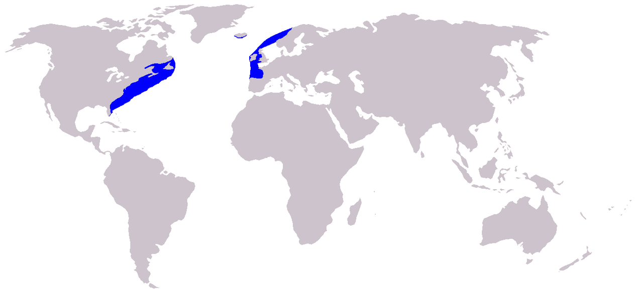De petits groupes vivent dans l'Ouest de l'Atlantique Nord : les zones d'alimentation se situent dans la partie sud de la baie de Fundy (près des îles de Grand Manan), au large Sud de la Nouvelle-Ecosse, dans la baie de cap Cod et dans le golfe du Saint-Laurent. Des zones de reproduction ont été découvertes au large de la Floride et de a Géorgie. L'espèce est considérée comme éteinte dans la partie Est de l'Atlantique Nord. Quelques rares observations sont probablement dues à des individus erratiques de la population Ouest.