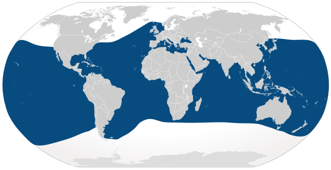 Cosmopolite, dans les eaux fraîches à tropicales. Surtout dans les zones côtières et au-dessus du plateau continental bien que des formes de haute mer existent. Il est observé dans de nombreuses mer fermées (mer Noire et Méditerranée) ainsi que dans les baies, les lagons, les estuaires. Il est très actif en surface où il chevauche les lames d'étrave et de sillage des bateaux. Il forme des petits groupes de 2 à 15 individus.